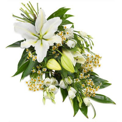 - Prześlij kondolencje za pomocą tego bukietu. W jego skład wchodzą lilie, eustoma oraz rumianek. Całość uzupełniają zielone dodatki. Do bukietu wykonanego przez lokalną kwiaciarnię Euroflorist istnieje możliwość dołączenia bileciku.