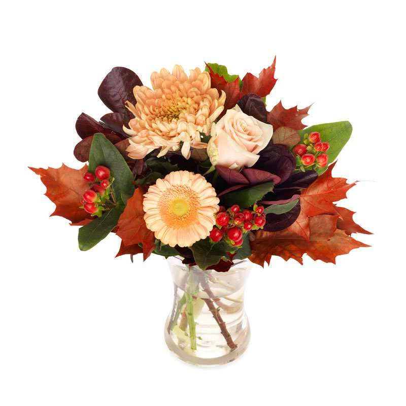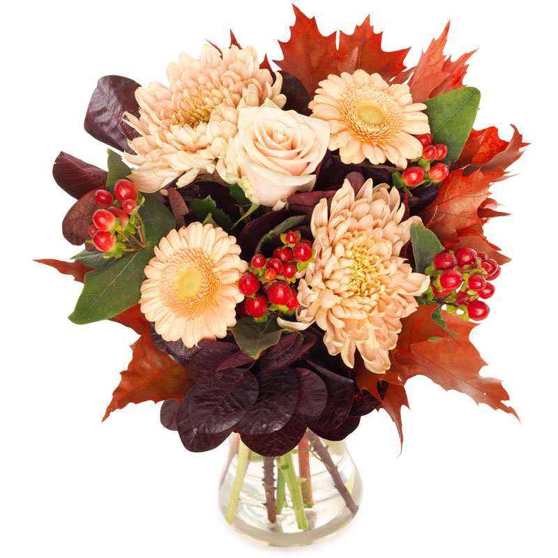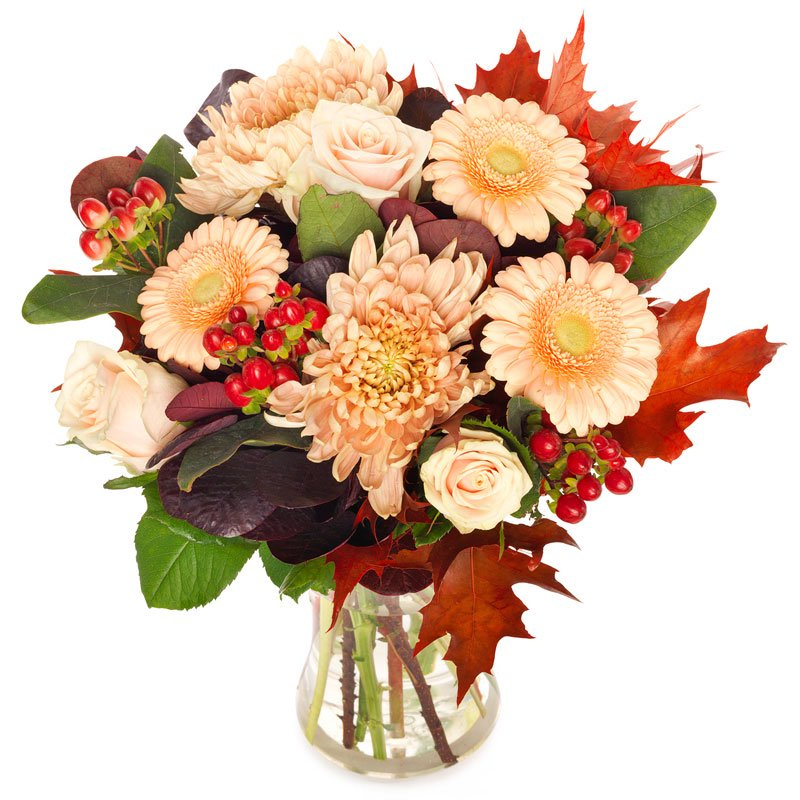 - Cudowny bukiet pokazujący w pełni piękno jesieni! Ułożony na okrągło z kwiatów w delikatnej pastelowej tonacji, gdzie całość dopełniają liście w żywych, wyrazistych kolorach.